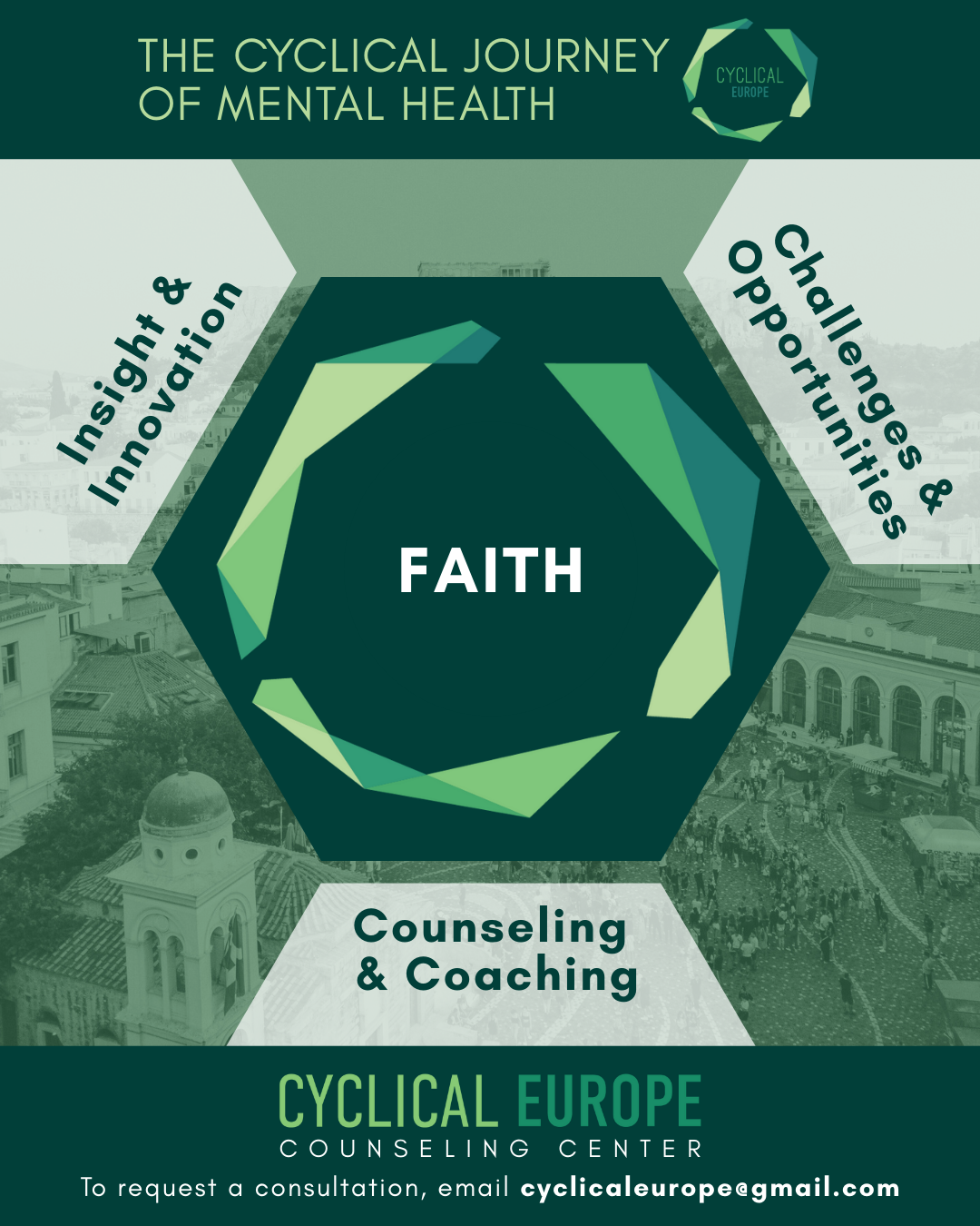The Cyclical Europe Counseling Center attempts to show the cycle of mental health and leadership growth that is possible through our anchoring Christian faith. However much life can feel out of control or chaotic, we can remain steady in our faith and know that 1) we are walking through trials like many who have gone before us and 2) there are resources around us and inside us that God can use to redirect and strengthen our steps. For we walk this journey of life by faith.